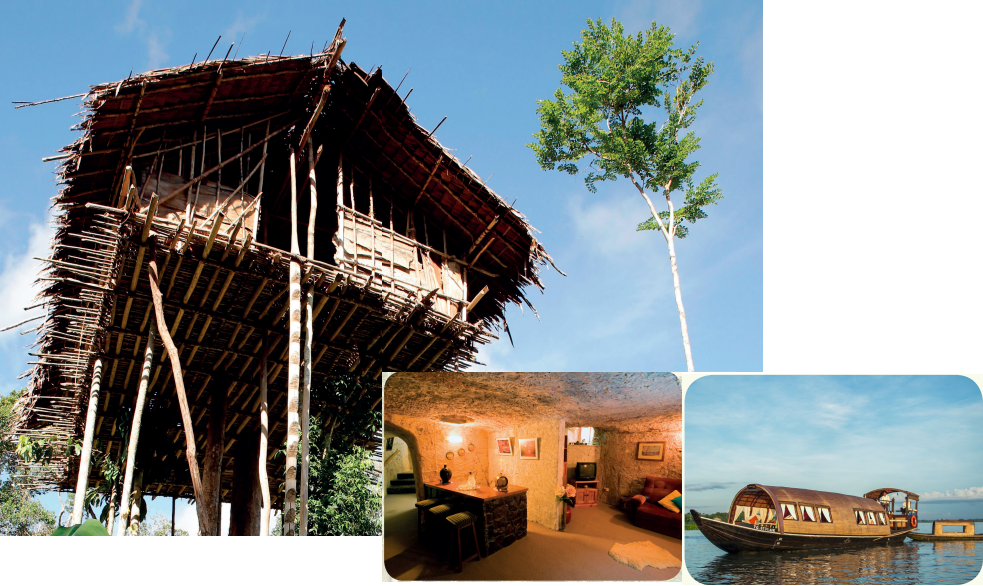 The Korowai Tribe of Papua New Guinea are strong and good at climbing. They have to be! They live in treehouses, which is sometimes forty-five metres above the ground. The dense rainforest is hot and humid; there are insects and dangerous animals. Treehouses protect the tribe from these dangers on the ground. They use materials from the forest to build the houses. They cut the top of a tree off and build the floor first. (1) B. It has to be strong because sometimes a family of twelve people live there. They use a ladder to get up and down. Imagine the breathtaking views from one of these treehouses!