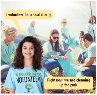 Thì Hiện tại tiếp diễn, dạng khẳng định: chủ ngữ “I” ngôi thứ nhất + am + V-ing → am volunteering.