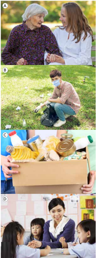 (Nghe bốn đoạn trò chuyện ngắn về các hoạt động từ thiện. Nối các cuộc trò chuyện từ 1 đến 4 với các bức tranh từ A đến D.)