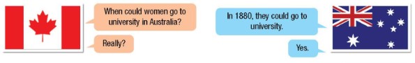 In pairs: In your country, what jobs are usually done by men/women?b. In pairs: Talk about what things you are allowed or not allowed to do at school. Are there different rules for boys and girls?a. Listen to Emma talking to her grandma, Donna. What is Emma's project about? b. Now, listen and circle the answers. c. Read the Conversation Skill box and listen to Task b. audio again. Number the phrases in the Conversation Skill box in the order you hear them. d. Listen and repeat. e. In pairs: In w