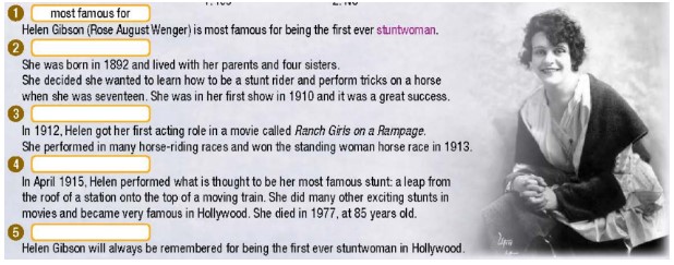 In pairs: Can you match the names to the pictures? Can you think of three other famous women from history? a. Listen to a talk about Amelia Earhart. Where is this talk taking place?a. Read the text about Helen Gibson. Did she live a long life? b. Now, read and answer the questions. c. In pairs: Do you think you could be a stuntman or stuntwoman? Why (not)? a. Read about writing a biography, then read Helen Gibson's biography again and add the words in bold above the correct paragraph.b. Reorder