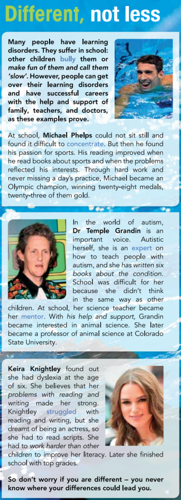 1 Look at the photos and the title of the article. Discuss the questions. 2 Read the text and check your ideas in Exercise 1. 3 Read the text again. Match questions 1-5 with the people described in the text. Write MK for Michael Phelps, TG for Temple Grandin, and KK for Keira Knightley. 4 Fill in the gaps with blue words from the reading text. Then work with a partner to complete the sentences with your own ideas.