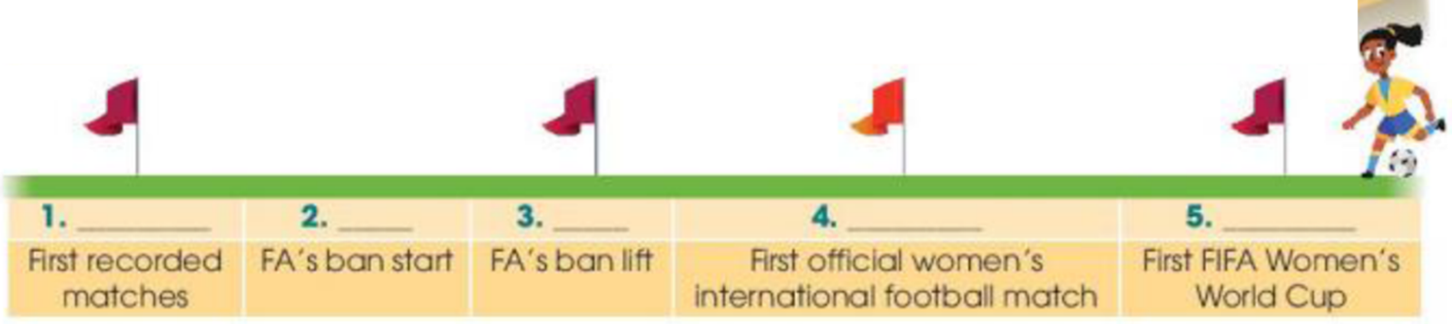 1. Read the text and fill the timeline about women’s football. 2. Work in pairs. Fill the timeline about women’s football in Viet Nam.