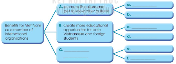 1. Complete the following sentences. Use the words in the box. 2. Complete the following diagram. Use the ideas in 1 and your own ideas. 3. Write a paragraph (120 - 150 words) about the benefits for Viet Nam as a member of international organisations. Use the information in the diagram in 2.