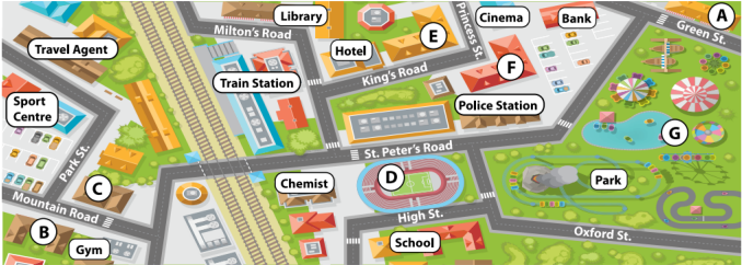 (Nhìn vào bản đồ. Quyết định bạn đang ở đâu và nơi bạn muốn đến. Yêu cầu và chỉ đường với bạn.)