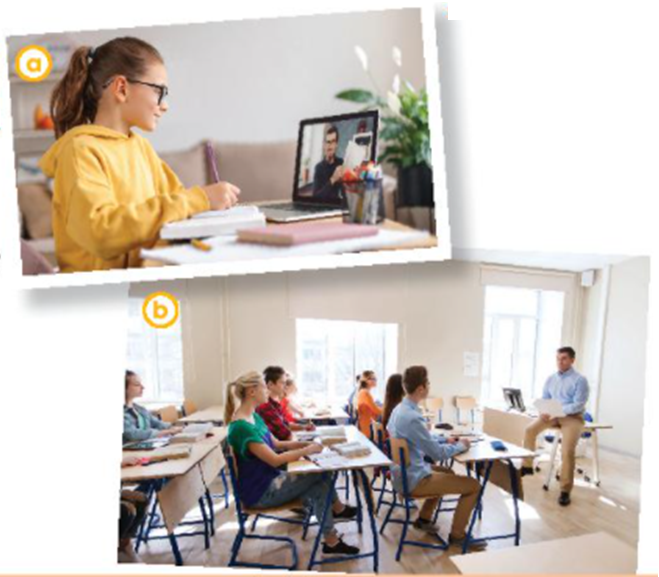(Học sinh trong ảnh a đang học trực tuyến qua máy tính xách tay của cô ấy trong khi các học sinh trong ảnh b đang học trực tiếp.)