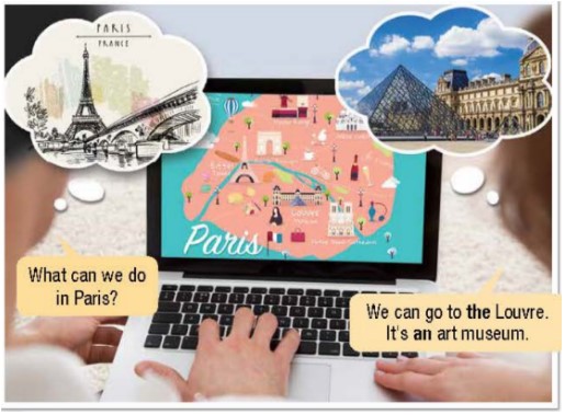 a. Match the words with the descriptions. Listen and repeat.b. In pairs: Use the words from Task a. to talk about places in your country.a. Read the article about visiting France. Match the paragraphs with the pictures.b. Now, read and answer the questions.c. In pairs: Would you like to visit France? Which of the places in the article would you like to visit most? Why? a. Listen and repeat. b. Fill in the blanks using a, an, the, or the zero article Ø.c. Match the articles in Task b. with their