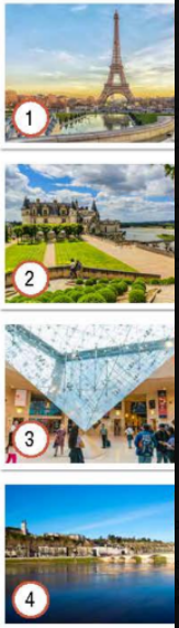 Our Top Four in France! From fantastic food to charming culture, France has it all! Here are our top four places to visit. A. The Louvre, one of the world's most famous art museums, has some of the world's greatest art. It's best known for being the home of the famous painting Mona Lisa. In 2018, it was the most visited museum anywhere, with about 25,000 visitors every day. B. If you visit Paris, you must visit the Eiffel Tower. It's the tallest building in Paris. There's an amazing view from the top, but how about enjoying dinner in the restaurant on the second level, at 125 meters? You can enjoy the view and great food. C. The Loire is France's longest river. It's known as the Garden of France because you can see lots of beautiful gardens and farms along the river banks. The part located between the towns of Sully-sur-Loire and Chalonnes-sur-Loir is a World Heritage Site. In the World Heritage Site, you'll find many beautiful buildings. D. If you want to visit a castle, we recommend the Chateau d'Amboise. During the 16th century, this beautiful castle was often visited by kings as they traveled the country. It's famous for its great views of the river. The artist and inventor, Leonardo da Vinci, is buried here, too! |
