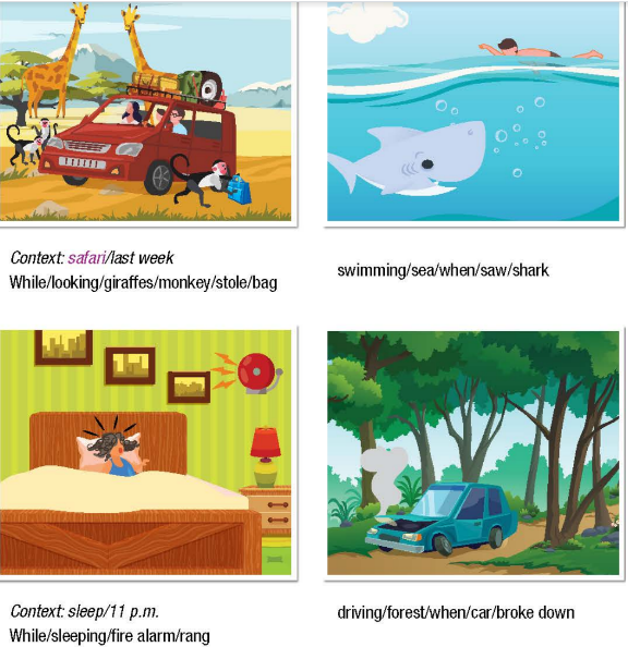 (1) We went on a safari last week. While we were looking at the giraffes, a monkey stole our bag.