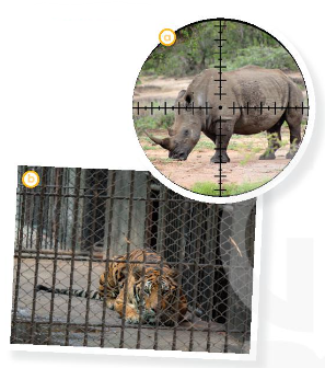 Picture b: The wild tiger is being kept in a cage. / The wild tiger is being held in captivity.
