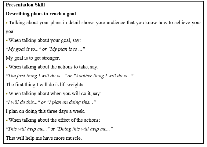 (Bạn sẽ thuyết trình về mục tiêu lối sống. Hãy lật sang trang 125 và sử dụng Mô hình Trình bày để giúp bạn viết kịch bản và thẻ gợi ý của riêng mình.)