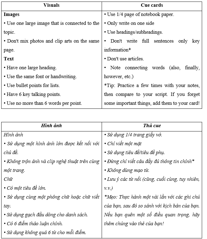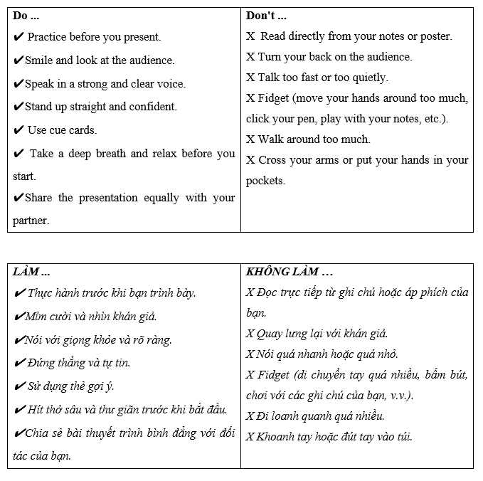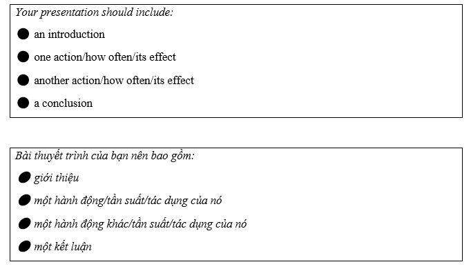(Thực hành bài thuyết trình của bạn với một đối tác. Hãy nhớ sử dụng các cụm từ trong hộp Kỹ năng thuyết trình.)