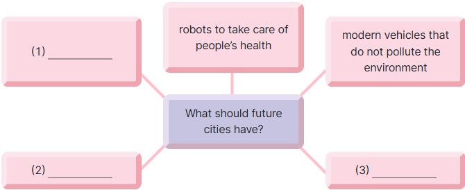 (Làm việc theo cặp. Thảo luận xem các thành phố trong tương lai nên có những gì để cư dân thành phố có thể sống lâu và khỏe mạnh. Điền vào sơ đồ.)