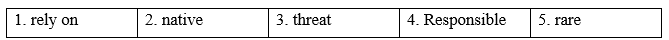 rare (hiếm) responsible (có trách nhiệm) rely on (dựa vào) endangered species (loài có nguy cơ tuyệt chủng) native (bản địa) threat (mối đe dọa) |