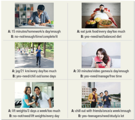 (Đọc các lời khuyên về sức khỏe từ một bảng mà bạn của bạn đã chia sẻ trên mạng xã hội. Theo cặp: Thảo luận nếu bạn đồng ý hoặc không đồng ý với số lượng được đề xuất cho mỗi hoạt động.)