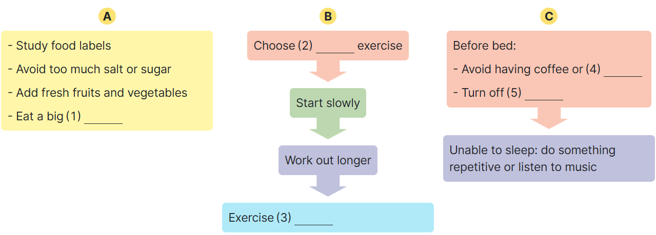 (Đọc lại bài viết. Hoàn thành các sơ đồ với thông tin từ văn bản. Sử dụng không quá HAI từ cho mỗi chỗ trống.)