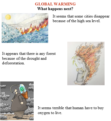 1. Listen and read the dialogue. Answer the questions. 2. Read GRAMMAR FOCUS and find examples of verbs of perceptions in the dialogue in Exercise 1. 3. Choose the best option to complete each sentence. 4. Complete the sentences with your own ideas. 5. In groups, predict what will happen in the next 20 years as a result of global warming.