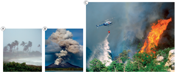 1. They are typhoons (a), volcanic eruption (b) and forest fire (c).