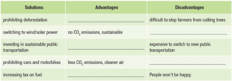 a. You're a scientist discussing ways that your government can fight global warming. Complete the table with ideas from the reading or your own ideas. In pairs: Discuss and agree on two solutions which you think are the most effective.