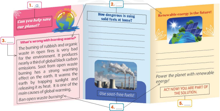1. Work in pairs. Match the ways to reduce black carbon emissions (1-3) with the reasons (a-i) for doing so. 2. Work in pairs. Label the parts of the leaflet with the words in the box. Use the tips on page 59 to help you. 3. You are organising your school’s Green Fair. Write about 120-150 words to complete the leaflet in 2. Use the suggested ideas in 1, and the tips above to help you.