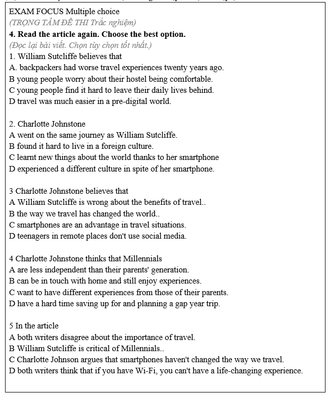 1. Imagine you are going on a journey alone to a distant location. Write A for advantages and D for disadvantages of travelling with a smartphone. 2. Look at the blue words in the article on page 69. What do these words mean? 3. Read the article. Which of the reasons for travelling in Exercise 1 is mentioned? 4. Read the article again. Choose the best option.