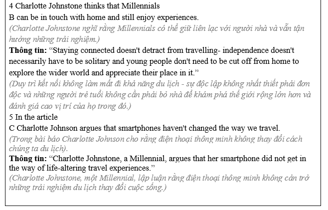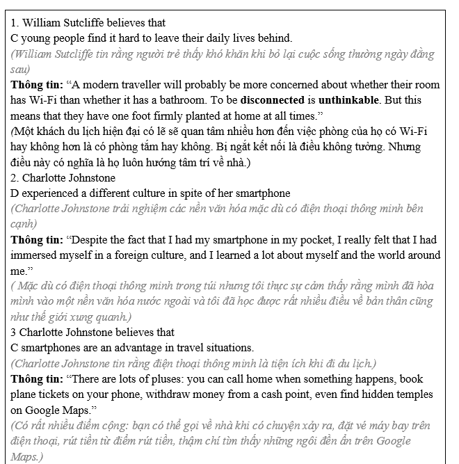 (Tôi nghĩ rằng chúng ta không thể ngừng giao tiếp hoàn toàn với gia đình khi chúng ta có quyền truy cập Internet không giới hạn. Gia đình chúng tôi có thể gọi cho chúng t bất cứ khi nào họ muốn vì họ biết thiết bị điện tử được kết nối với Internet. Ngược lại, chúng ta không thể ngừng liên lạc với mọi người vì chúng ta luôn muốn chia sẻ những điều mới mẻ trong hành trình.)