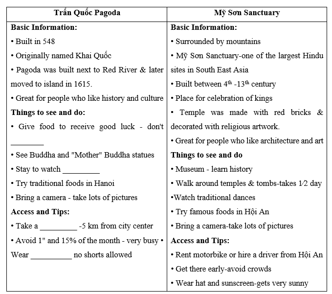 a. You're interviewing a tourism officer to write about a tourist attraction. In pairs: Student B, Student A, you're the interviewer. Ask about Trấn Quốc Pagoda to complete the notes.