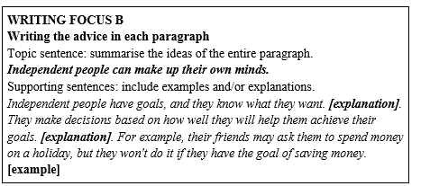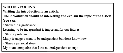 1. What advice would you give to a person to become more independent? Brainstorm ideas in your group, and make a mind-map to present your ideas. 2. Read the text and put the paragraphs in order. Number the paragraphs 1-5. 3. Match the activities with these qualities: decisive, determined, self-reliant, and responsible. Fill in the blanks with the qualities. 4. Read the WRITING FOCUS A and B and complete the paragraphs with your ideas.