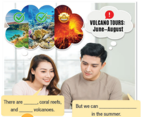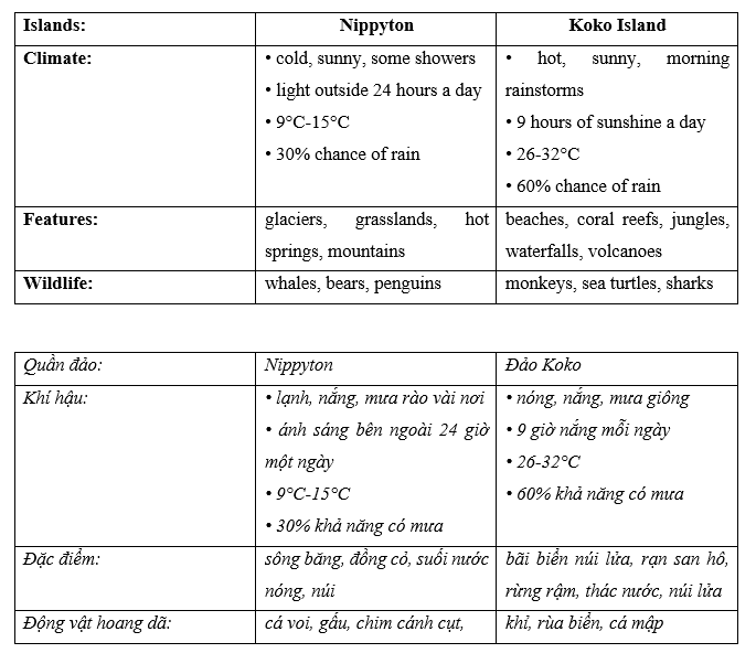 (Hãy tưởng tượng bạn đang lên kế hoạch cho một kỳ nghỉ hè. Sinh viên A, bạn thích thời tiết ấm áp, bơi lội và những con vật dễ thương. Sinh viên B, bạn thích thời tiết lạnh, đi bộ đường dài và những động vật nguy hiểm. Theo cặp: Thảo luận về các đặc điểm của đảo Nippyton và đảo Koko. Sau đó, quyết định nơi bạn sẽ đi cùng nhau.)