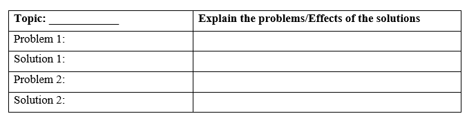 (Chọn một vấn đề và suy nghĩ về hai vấn đề và hai giải pháp, sau đó điền vào bảng. Thêm chi tiết để giải thích các vấn đề và giải pháp.)