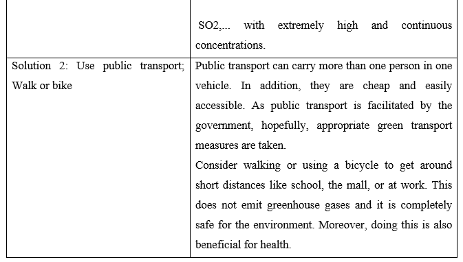 Một vấn đề là ô nhiễm không khí gây hại cho sức khỏe con người. Hít thở không khí bẩn có thể gây ra bệnh phổi, hen suyễn và thậm chí là ung thư. Nhiều người dân ở các thành phố lớn đang phải chịu đựng những vấn đề này. Một giải pháp là giảm số lượng ô tô trên đường. Mọi người nên sử dụng phương tiện giao thông công cộng, đi xe đạp hoặc đi bộ thường xuyên hơn.