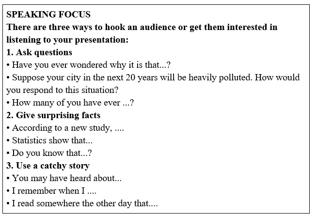 5. Work with a partner and write a different opening for the talk in Exercise 2 using one of the other hooks in the SPEAKING FOCUS.