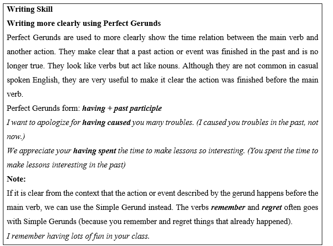 a. Read the Writing Skill box and Patricia's letter again. Then, underline the Perfect Gerunds that Patricia used in her letter.