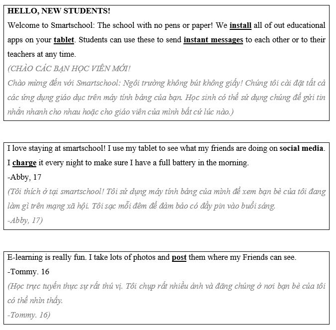 Như bạn đã biết, chúng tôi đã chuyển đổi sang hình thức học trực tuyến không cần giấy tờ vào năm ngoái. Chúng tôi (1) __________ sử dụng sách giấy và sổ tay. Tất cả các nghiên cứu của chúng tôi bây giờ diễn ra trên máy tính bảng. Sự thay đổi không hề dễ dàng, nhưng trường học của chúng tôi đã nhận được nhiều lợi ích. Các sinh viên bây giờ quan tâm nhiều hơn đến công việc học tập của họ. Ngoài ra, họ có thể học các kỹ năng mới quan trọng sẽ giúp ích cho họ trong tương lai. Nhìn chung, đó là một thay đổi tích cực cho trường học của chúng tôi.