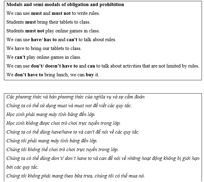 (Làm theo cặp: Sử dụng các mô thức và bán mô thức để nói về các quy tắc ở trường của bạn.)