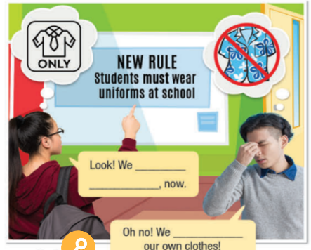 Look! We have to wear uniforms, now. (Nhìn kìa! Bây giờ chúng ta phải mặc đồng phục.)