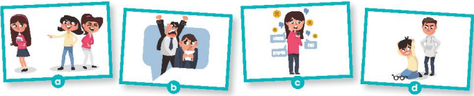 (Nghe đoạn hội thoại giữa hai học sinh và nối các bức tranh với kiểu bắt nạt.)