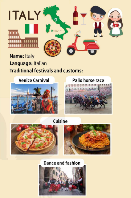 Work in groups. Choose a country and do some research on its culture. Give a group presentation. It can include some of the following information: