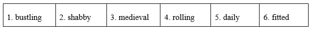 bustling daily fitted medieval (nhộn nhịp) (hàng ngày) (được trang bị) (thời trung cổ) rolling running shabby (nhấp nhô) (chạy) (tồn tàn) |