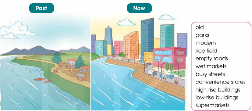 (Những hình ảnh cho thấy River City đã thay đổi như thế nào theo thời gian. Làm việc theo cặp. Đọc các từ và cụm từ và quyết định từ nào mô tả thành phố trong quá khứ (P) và thành phố nào bây giờ (N).)