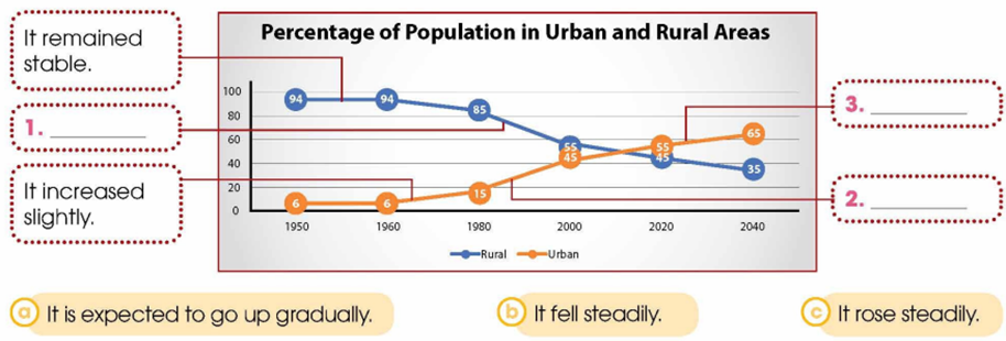 A. By contrast, the urban population rose throughout the same period. In 1950, the percentage of urban population was just around 6 per cent. It increased slightly to 15 per cent in 1980. After that, the figure rose steadily and in 2000 it stood at 40 per cent. The upward trend continued and in 2020, more than half of its population lived in urban areas. In the next twenty years, the urban population is expected to reach 65 per cent of the total population.