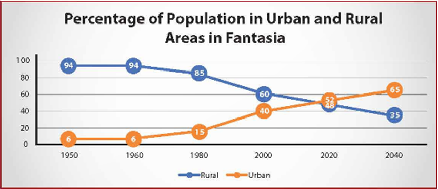 C. Năm 1950, 94% hay phần lớn dân số Fantasia sống ở khu vực nông thôn. Con số này duy trì ổn định cho đến năm 1960. Tuy nhiên, từ năm 1960 đến năm 1980, tỷ lệ dân số nông thôn giảm nhẹ xuống còn 85%. Con số này giảm dần xuống còn 48% vào năm 2020 và dự kiến sẽ giảm xuống 35% vào năm 2040.