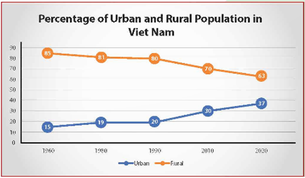 The line graph illustrates the percentage of the urban and rural population in Vietnam from 1960 to 2020. The data reveals a clear trend of urbanization over the decades.