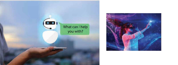 (Các hình ảnh cho thấy một số ví dụ về AI: chatbot, thực tế ảo,… Chúng ta có thể thấy chúng trên một số nền tảng trực tuyến và trang web dành riêng cho các công nghệ này như ChatGPT, và SteamVR.)