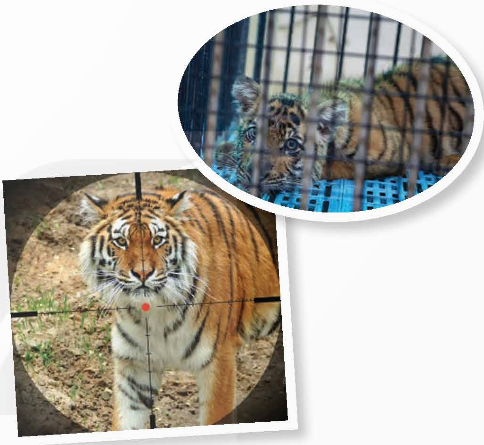 The tigers in the picture are being hunted and kept in a cage. We can stop poaching and release them to protect them.