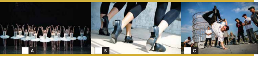 1. Match the photos A-C with paragraphs 1-3. 2. Read the article again and tick the appropriate column.3. PROJECT. Work in groups. Use the Internet to find out about a popular type of art in your country. Make notes about : 4. PROJECT Project. Write a paragraph (60-80 words) about the dance in Exercise 3.