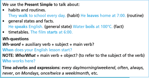 Trạng từ chỉ thời gian và cách diễn đạt: every day/morning/weekend (mỗi ngày/buổi sáng/cuối tuần), often (thường xuyên), always (luôn luôn), never (không bao giờ), on Mondays (vào thứ 2 hàng tuần), once/twice a week/month (1/2 lần 1 tuần/tháng),….
