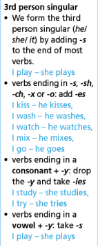 - Đối với thì hiện tại đơn với ngôi thứ 3 số ít (he/she/it) chúng ta thêm “s” vào cuối của hầu hết các động từ.