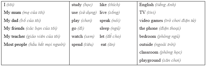 RULES (QUY TẮC) 1. We use the present simple to talk about facts, habits and routines. (Chúng ta sử dụng thì hiện tại đơn để nói về các sự kiện, thói quen và quy trình.) 2. Affirmative verbs end with -s / es in he / she / it forms. (Động từ khẳng định kết thúc bằng -s / es ở dạng he / she / it.) 3. Negative forms use don’t + infinitive without to after I / you / we / they. (Dạng phủ định sử dụng don’t + động từ nguyên mẫu sau I / you / we / them.) 4. Negative forms use doesn’t + infinitive without to after he / she / it. (Dạng phủ định sử dụng doesn’t + động từ nguyên mẫu sau he / she / it.) |