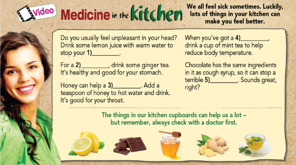1. Look at the pictures. Listen and repeat. 2. Read the title of the article and look at the pictures. What medicine can someone find in the kitchen? 4. What is the author’s purpose: to answer? to persuade? to inform? Is the information in the text useful to you? Why? 5. Which medicine in the article did you know about? Do you know any other medicine in the kitchen? Tell your partner.